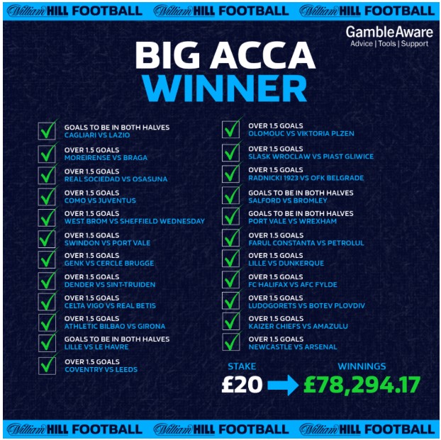 “Det her er en af de mest imponerende oddset-kuponer, vi har set i lang tid. Det er ikke bare en rent skud i tågen, når man holder sig lige præcis over 1.5 mål og scoringer i begge halvlege. Og så i ufattelige 23 forskellige kampe fra 10 lande. Det må have været en nervepirrende rutsjetur for vores dygtige kunde,” siger Lee Phelps, talsmand for William Hill.