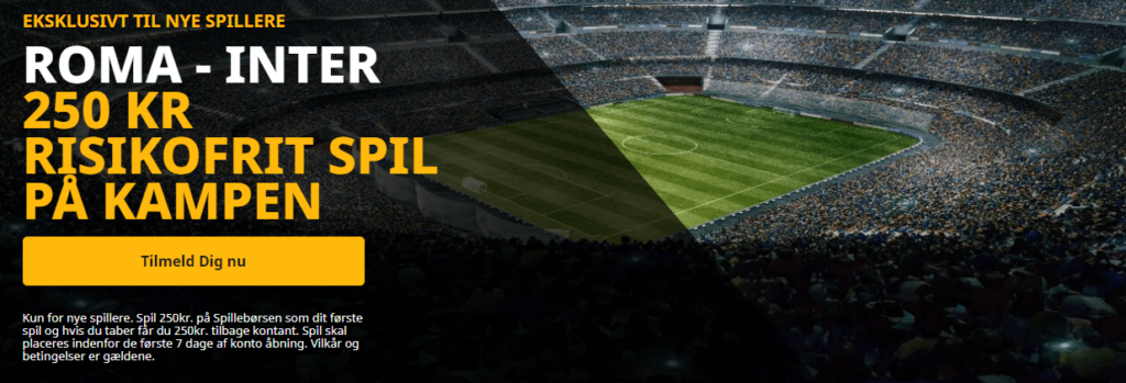 Sidder du og brænder inde med gudeoddset, så kan du lige så godt spille på Betfair. Er du ikke kunde hos Betfair endnu, tilbyder de et risikofrit spil på 250 kr. deres spillebørs. Det simple tilbud indebærer at du skal spille 250 kr. på kampen mellem AS Roma og Inter. Hvis du taber, refunderer Betfair beløbet til fri afbenyttelse.