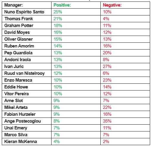“Nuno Espirito Santo og hans højtflyvende Nottingham Forest står tydeligvis for en god underdog historie. Arne Slot henter til gengæld færrest negative reaktioner af managers for de traditionelle top seks klubber,” udtaler Brand Manager for online bingo website Heart Bingo, Sarah Caskie.