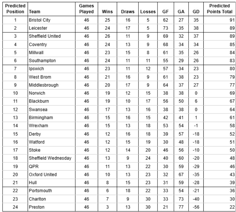 Hele Championship-sæsonen er blevet simuleret og analyseret af spilselskabet VBET ved hjælp af en supercomputer. Sidst sæsons semifinalist i playoff, Bristol City får ifølge computeren masser at fejre til foråret. Klubben vinder nemlig ligaen, og rykker dermed op i Premier League for første gang. Desuden forudser computeren Leicester City endnu en hurtig tilbagevenden til den bedste række.