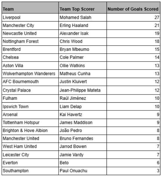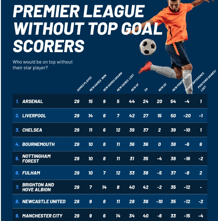 Næst efter Liverpool er Nottingham Forest den klub, der ville mærke tabet af topscorerens mål mest. Chris Woods 18 scoringer har givet 16 point. Manchester City må se bort fra 15 point, når man fjerner Haalands scoringer. Tottenham ville rykke fire pladser op uden James Maddisons ni ligamål.